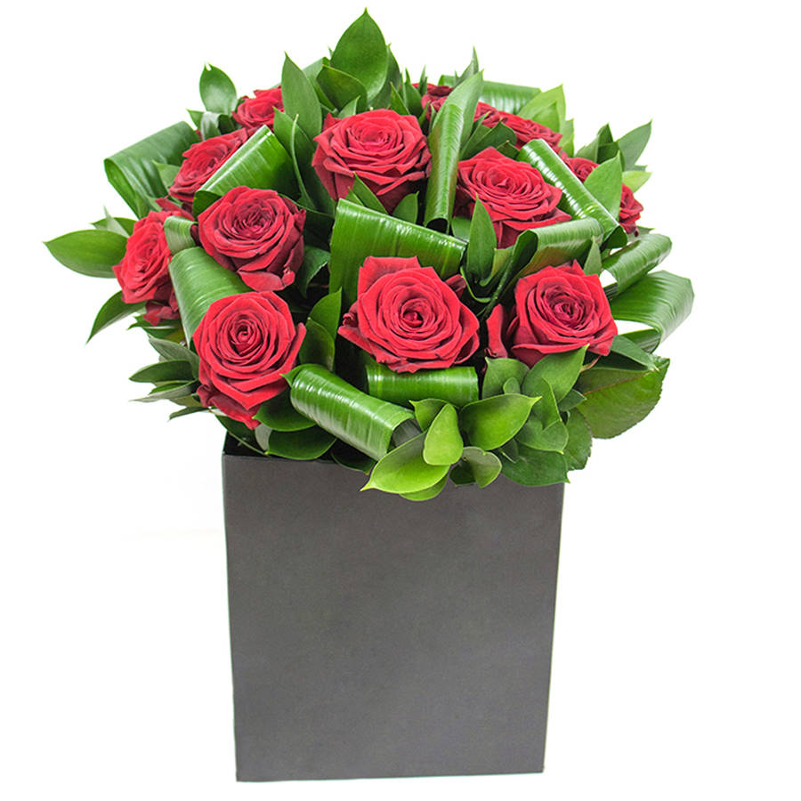 Indulge in the elegance and uniqueness of our captivating bouquet, showcasing rich red roses, graceful aspidistra leaves, and charming ruscus. This sophisticated arrangement is sure to enhance any space with its stylish appeal.