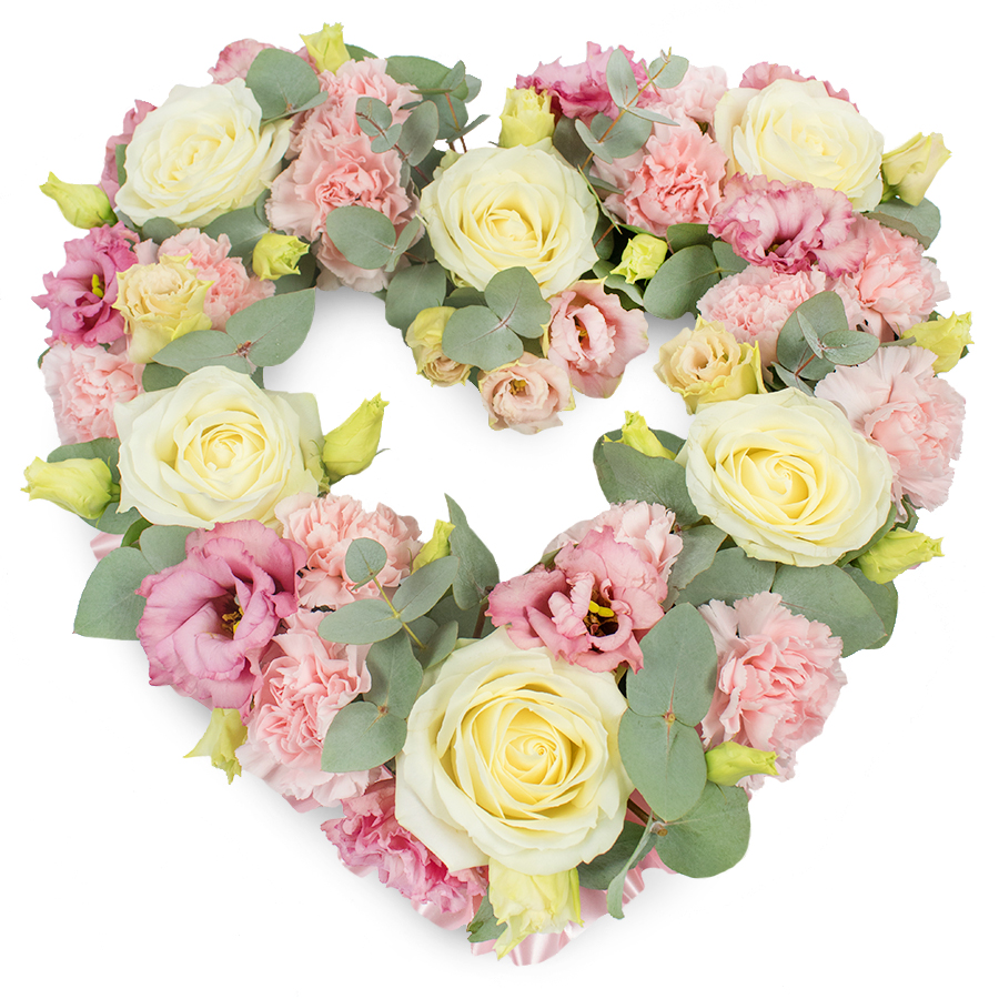 Create a lasting memory with our Peaceful Remembrance Bouquet, thoughtfully crafted to express your deepest sympathies. This beautiful arrangement showcases white roses, pink carnations, pink lisianthus, and aromatic eucalyptus leaves.